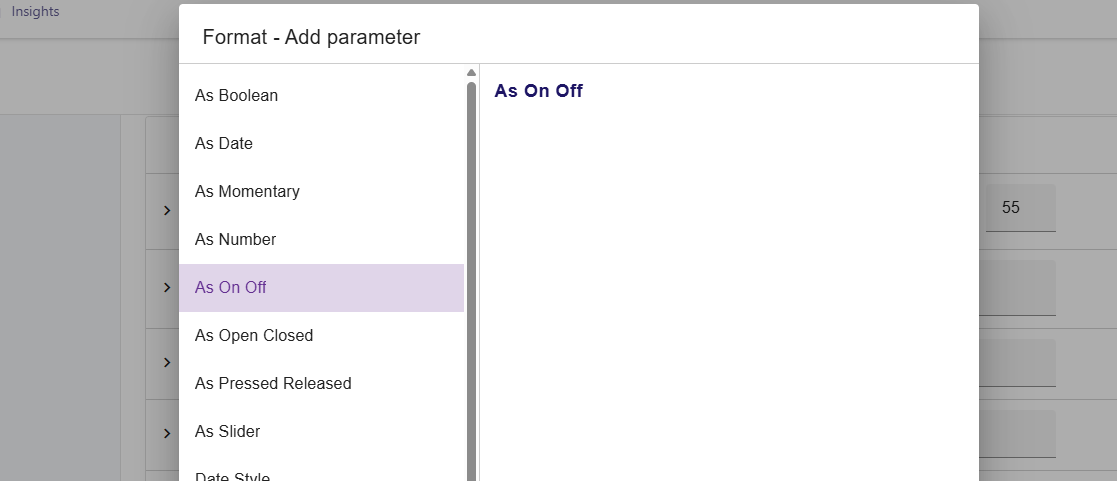Then configure the format, by adding a parameter. Choose “As On Off”